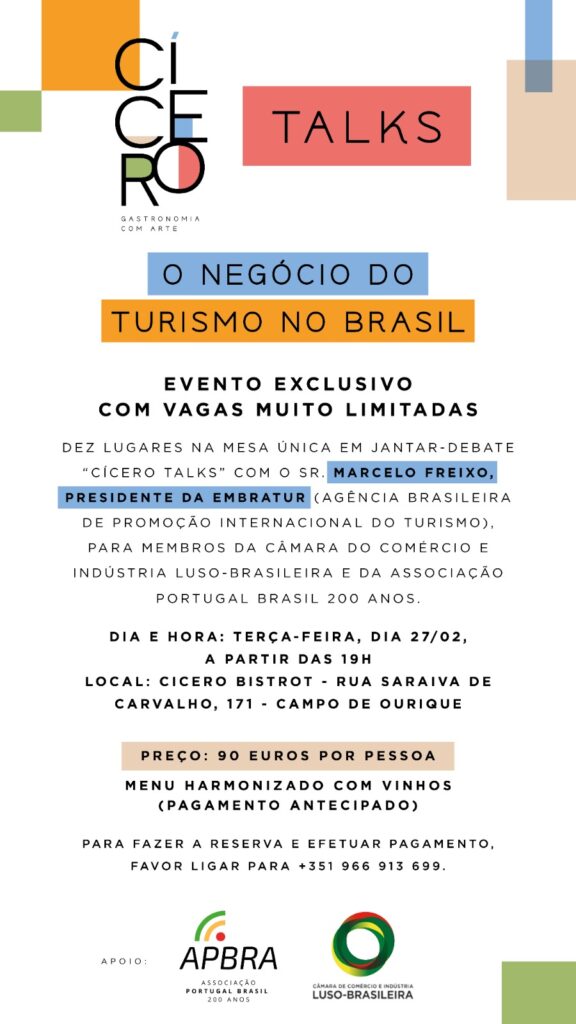 A Câmara de Comércio e Indústria Luso-Brasileira, em parceria com a Associação Portugal Brasil 200 anos e o Cícero Bistrot, vai oportunizar 10 lugares na mesa única em jantar-debate “Cícero Talks” com o Sr. Marcelo Freixo, Presidente da Embratur – Agência Brasileira de Promoção Internacional do Turismo. O evento acontecerá no dia 27 de fevereiro a partir das 19h no Cícero Bistrot, localizado na Rua Saraiva de Carvalho, 171, em Campo de Ourique, Lisboa.