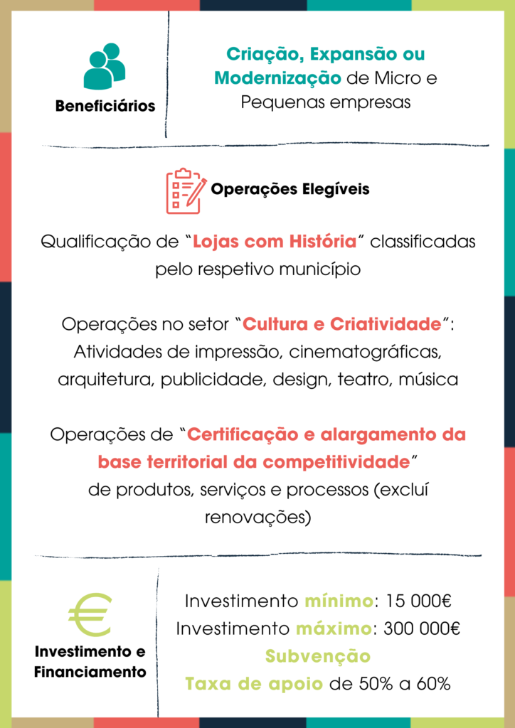 Para as categorias “Lojas com História” e “Cultura e Criatividade“, são elegíveis despesas com: