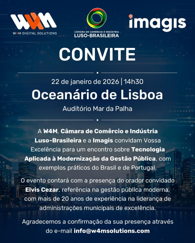 Lisboa recebe, no próximo 22 de janeiro de 2026, às 14h30, no Auditório Mar da Palha, no Oceanário de Lisboa, uma conferência dedicada à modernização da gestão pública por meio do uso estratégico da tecnologia. O evento é promovido pela W4M e pela Imagis, empresas que desenvolvem soluções tecnológicas utilizadas diariamente por administrações públicas no Brasil e em Portugal, e conta com o apoio da Câmara de Comércio e Indústria Luso-brasileira.